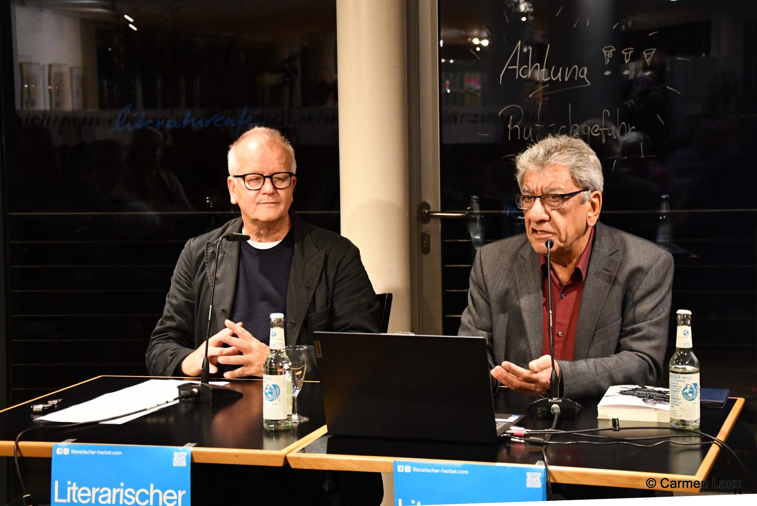 An diesem Abend im Literaturcafé des „Haus des Buches“ im Leipziger Osten soll im Rahmen des Literarischen Herbst über das Leben und Schreiben im Exil gesprochen werden. Auf den schwarzen quadratischen Tischen stehen Weingläser und Limoflaschen, Gespräche klingen nach, bis das Licht gedimmt wird. Der Moderator begrüßt „zwei ausgewiesen wichtige Protagonisten, die sich um die Geschicke von Kolleginnen und Kollegen im Exil kümmern“: Najem Wali und Irina Scherbakova.