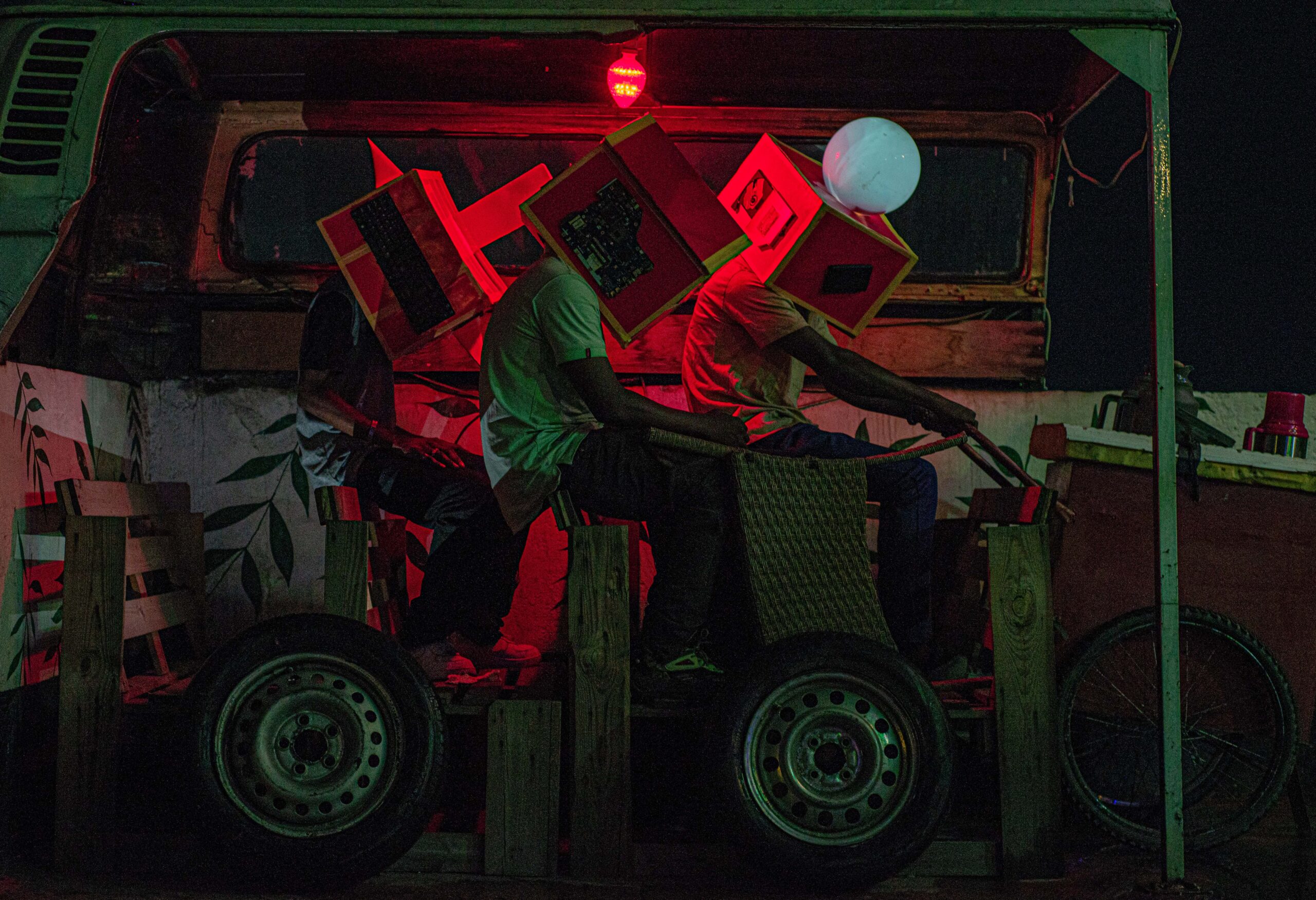 Diese sprachliche Analogie erschiene treffend genau, wäre die Kamera für das erste Drittel nicht hinter einem Gitter verborgen und die dunkle Außenwelt nur im diffusen Lichtschein zu erahnen. Statt erklärenden Dialogen führt ein langer Schriftblock in den Konflikt zwischen der Demokratischen Republik Kongo und Ruanda ein. Statt Dialogen zwischen Figuren erzeugen Bruchstücke aus Radioausstrahlungen ein Gefühl des nächtlichen Kinshasas. Mitten in der Nacht fährt eine Gestalt, das Gesicht unter einer häusernen Maske versteckt, ein Straßencafé durch die kongolesische Hauptstadt. Bauarbeiter gehen ihrer Arbeit nach, während eine Gruppe ähnlich maskierter Gestalten sich ruckartig auf einem statischen Autogefährt hin und her bewegt. Shongo verweigert, abgesehen vom anfänglichen Kontext, jegliche Art von narrativer Erzählung; erzeugt Bedeutung stattdessen durch Performance und Geräuschkulisse. Auf die Publikumsfrage, für wen Café Kuba gedreht wurde, antwortete Shongo mit „for me“. Das merkt man dem „Film“ auch an.